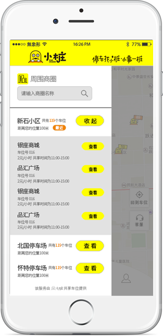 将智能停车场及个人闲置停车位资源联网,打破信息孤岛,用户通过小桩平台可以搜索离自己最近的空闲车位,还可以享受车位导航的进场服务,实现就近停车引导,停车变得很简单。